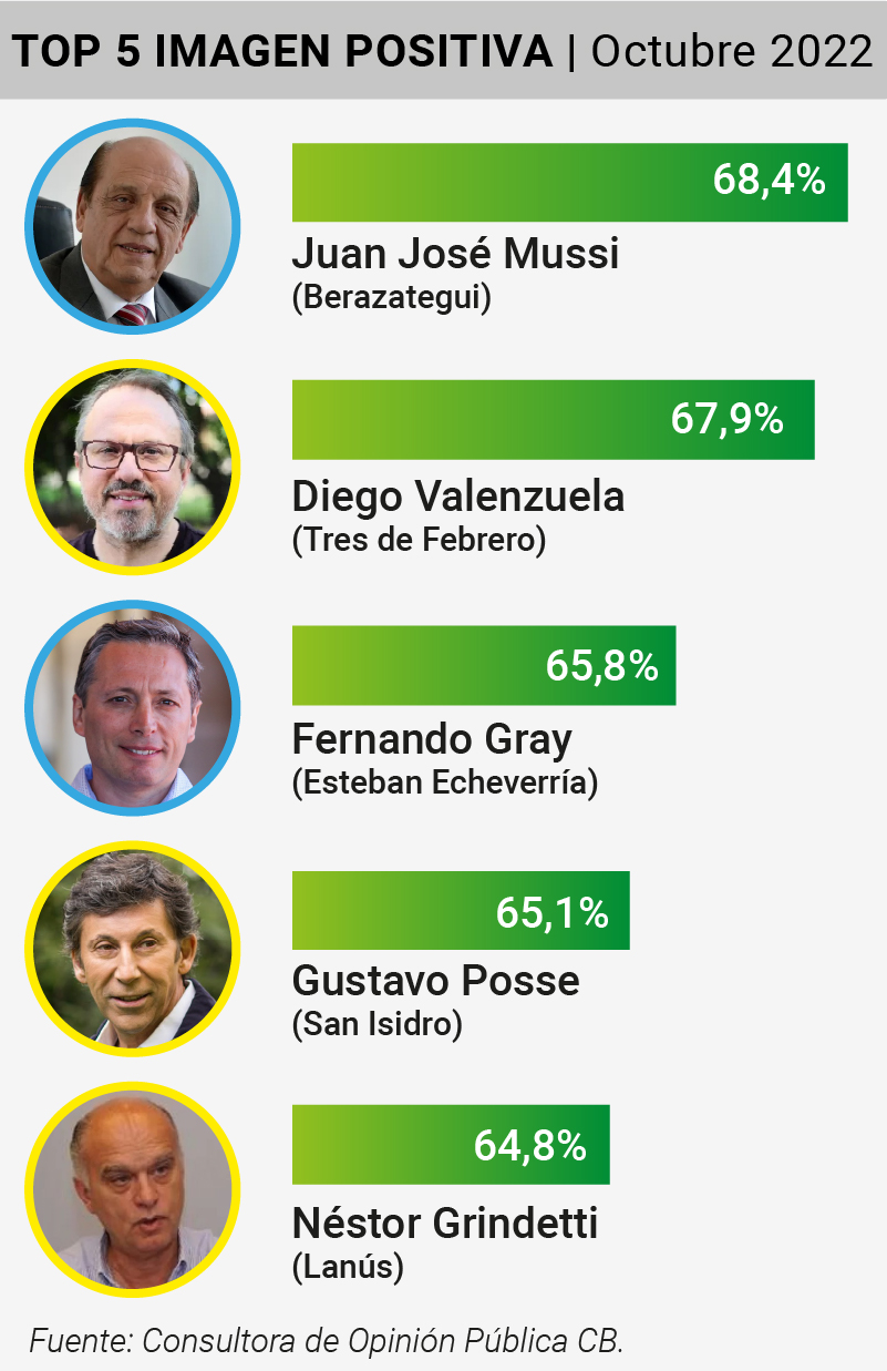 Según el relevamiento, el intendente con mejor imagen es Juan José Mussi, de Berazategui, con una aprobación de 68,4%. Lo siguen de cerca Diego Valenzuela, de Tres de Febrero, con 67,9%, y Fernando Gray, de Esteban Echeverría, con 65,8%. El primero es del Frente de Todos, mientras que el segundo es de Juntos y el tercero es oficialista, aunque está distanciado por mantener diferencias con Máximo Kirchner.