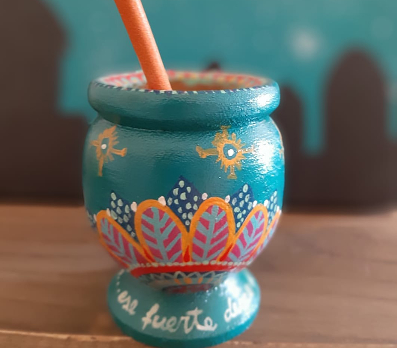 Los mates que pintan con acrílicos y marcadores son de algarrobo. “Para protegerlos usamos laca, aunque recomendamos no empapar la parte de afuera al lavarlo, para que duren más. Solemos hacer lo que nos pide la gente: desde logos, mandalas, frases, escudos de bandas o de equipos de futbol. Muchas veces solamente quieren que tenga ciertos colores y, en base a eso, nosotras creamos algo”, explica Sofía.