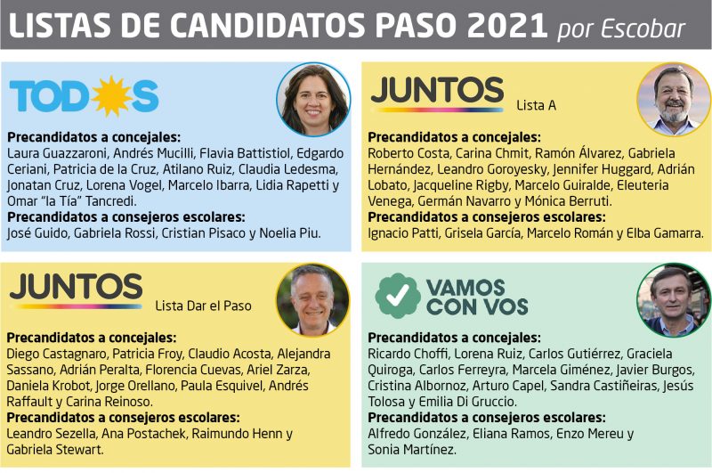 La oferta electoral escobarense será bastante amplia, con 15 listas. Un total de 420 precandidatos a concejales y consejeros escolares, entre titulares y suplentes, teniendo en cuenta que cada una está compuesta por 28 personas. El menú, no obstante, será más acotado que el de las últimas elecciones legislativas, en las que hubo 19 boletas. En las ejecutivas de 2019 fueron 9.